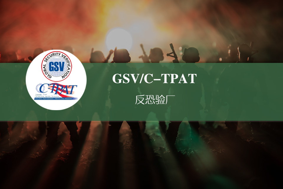 反恐验厂即(GSV)/(C-TPAT)认证。GSV是Global Security Verification的缩写,是Wal-Mart验厂三大部分的一个部分! 也就是反恐这一块!验厂内容大概涉及到工厂的保安,仓库,包装,装货,出货这些环节吧!通过GSV审核之后会有一个美国海关发放的GSV证书!